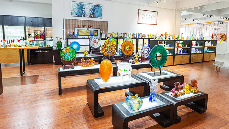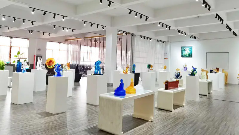 آثار هنری شیشه ای به تدریج از هدایای صنایع دستی سنتی تکامل یافته و شامل اثاثیه تزئینی، فرهنگ بودایی، ظروف کریستالی و جواهرات مد روز می شود. پایگاه تولید این شرکت در شهر زیبا و پر رونق آبی Jinxi در Kunshan استان جیانگ سو واقع شده است. دارای فضای تحقیق و توسعه برای تولید شیشه است که 35000 متر مربع را پوشش می دهد. این مرکز مجهز به قابلیتهای طراحی مستقل، تکنیکهای مدلسازی خاک رس و منابع تحقیق و توسعه فنآوری است که مهارتهای بالغ را در فرآیندهای توسعه و تولید محصول نشان میدهد.