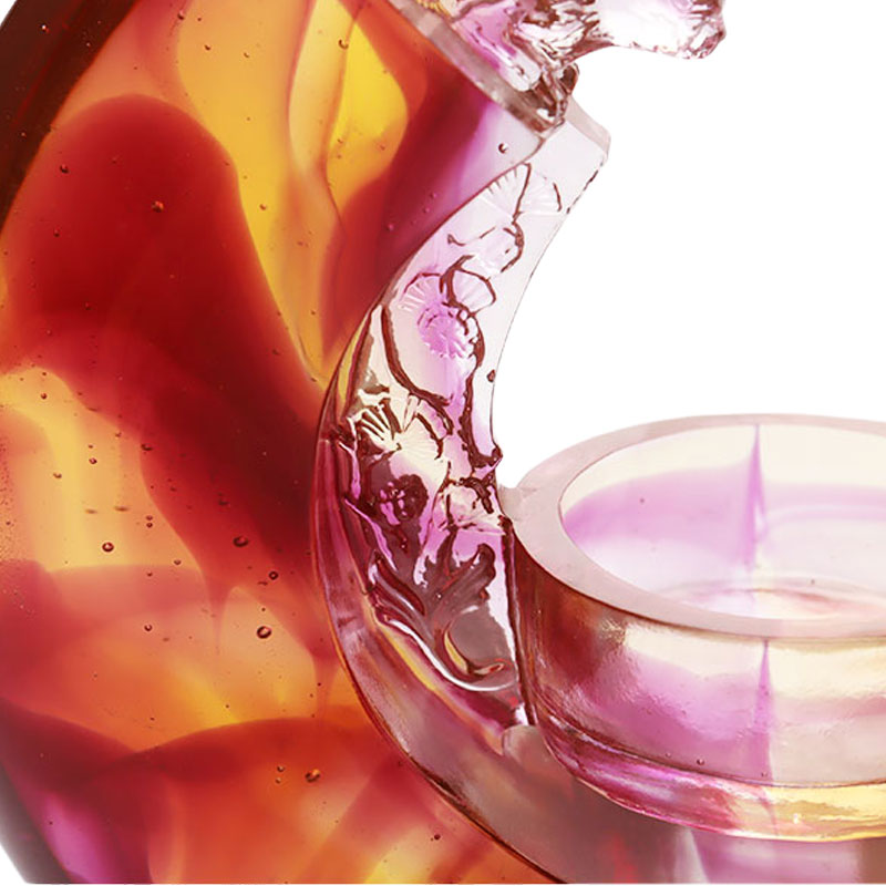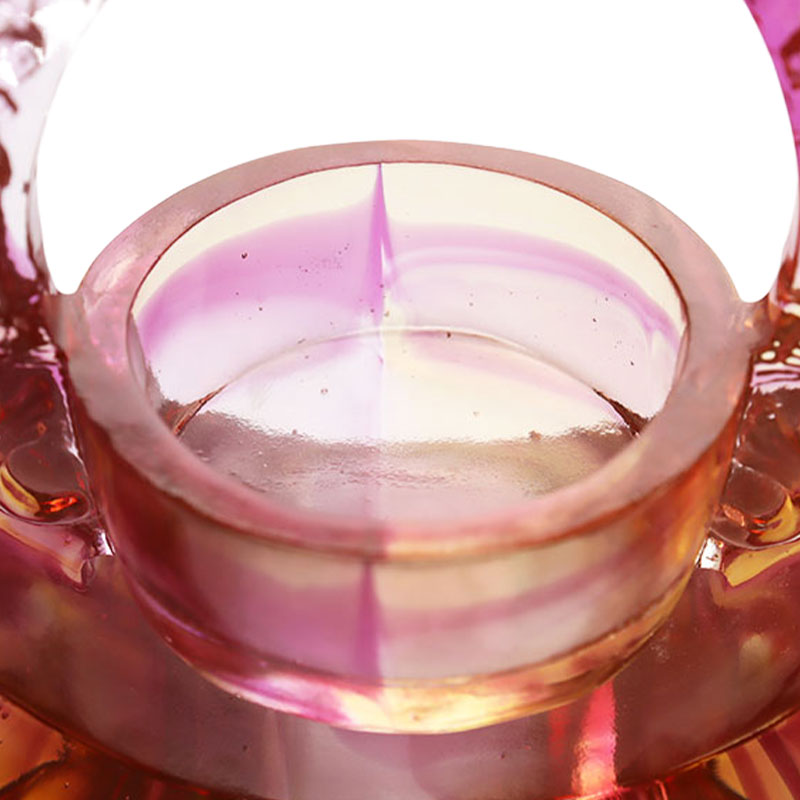 مواد لعاب رنگی به شمعدان بافتی رویایی می بخشد. رنگ های آن به زیبایی غروب خورشید است. رنگ‌های قرمز، زرد و بنفش با یکدیگر ترکیب می‌شوند و به نظر می‌رسد که رنگ‌های جاری زمان را در این لحظه شگفت‌انگیز منجمد می‌کنند. انتقال هر رنگ طبیعی و صاف است و جذابیت منحصر به فرد لعاب رنگی را نشان می دهد. شکل شمعدان مبتکرانه است، با طراحی هلالی در دو طرف، خطوط صاف و کشش، گویی ریتمی ظریف را بیان می کند. حکاکی‌های نفیس در بالای آن ظریف و واضح هستند، مانند الف‌هایی که از نور شمع محافظت می‌کنند و حس رمز و راز و چابکی را به کل شمعدان اضافه می‌کنند. قسمت وسطی که شمع در آن قرار داده شده است، بسیار کاربردی و زیبا طراحی شده است و به شکل مطلوبی در شکل کلی ادغام شده است. از نظر کاردستی، این شمعدان لعاب رنگی سطح بسیار بالایی از تولید را در خود جای داده است. شفافیت و براق بودن لعاب رنگی به آن افزوده شده است و تمام جزئیات به درستی و بدون کوچکترین ایرادی مدیریت می شود. چه به عنوان شمعدان استفاده شود و چه به عنوان یک اثر هنری مستقل به نمایش درآید، می تواند جذابیتی مست کننده داشته باشد و ارزش منحصر به فرد هنر لعاب رنگی را برجسته کند.